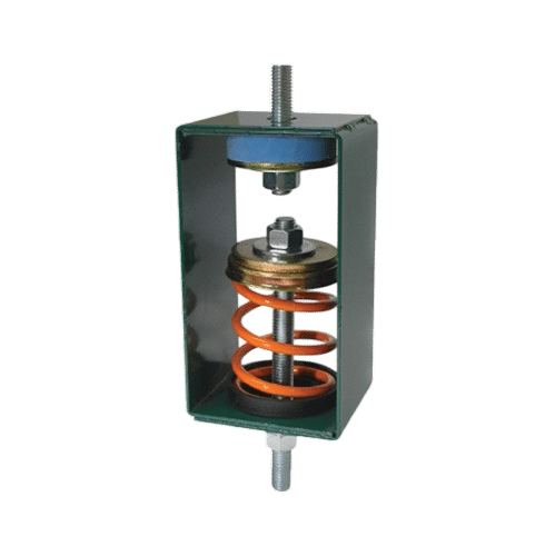 Vibro-Acoustics Closed-Mount Spring (CM) series provides vibration isolation for mechanical equipment. The steel telescoping housing incorporates neoprene stabilizers to prevent metal-to-metal contact, while still providing a rigid lateral support. Springs are engineered to provide an additional 50% overload capacity and powder-coated to prevent corrosion. All other hardware is zinc plated, including leveling and adjustment nuts used to position and secure the equipment.